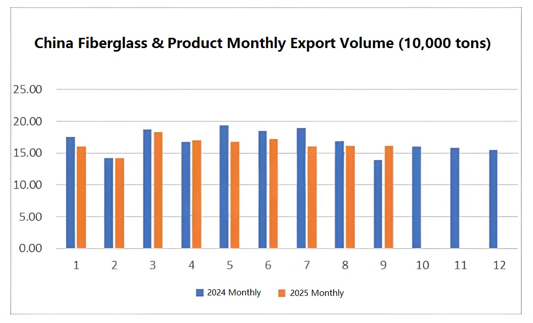 From January to September 2025, China’s total export volume of glassfiber and related products reached 1.4785 million tons, representing a 4.5% year-on-year decrease.